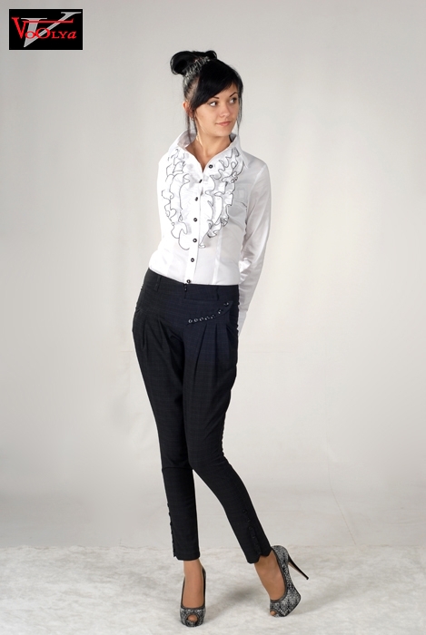 Спереди есть функциональные карманы, от бедровочного пояса вниз красиво расходятся складки, придавая верху брюк форму тюльпана, оригинальная форма гульфика, декорированного имитацией петель и множеством пуговиц придаёт модели определённого шарма и индивидуальности.
