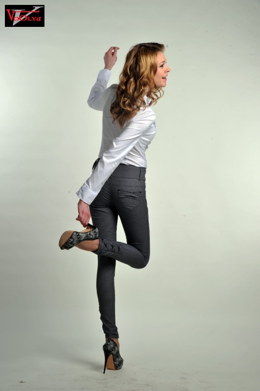 Облегающий покрой подчеркнёт все достоинства женской фигуры. Спереди есть функциональные карманы, сзади накладные фигурные карманы, декорированные тканевыми бантами и лаковыми хольнитенами. Такие же тканевые банты повторяются, как элементы, на вставке внизу брюк.