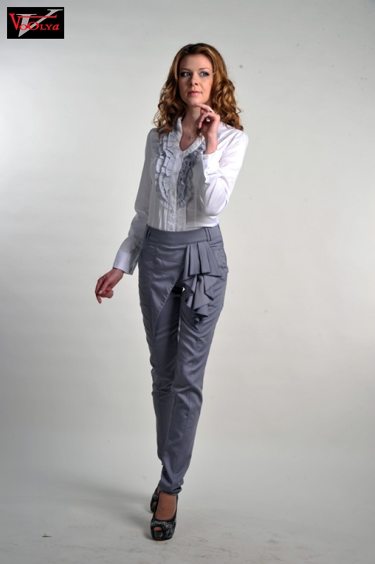 Брюки изготовлены из турецкого стрейчевого полированного габардина. Ткань лёгкая, но её плотности хватает для того, чтобы удачно скрывать какие-либо изъяны женской фигуры.