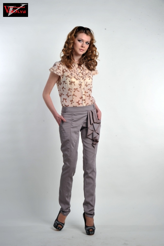 С одной стороны модель выполнена на запах - прикрывая гульфик, с другой стороны из пояса вниз красиво спадает тканевый большой бант, придавая брюкам особого шарма и женственности. Спереди есть функциональные карманы, сзади кокетка с листочками (имитации карманов) и фигурными элементами.Размеры 32-42